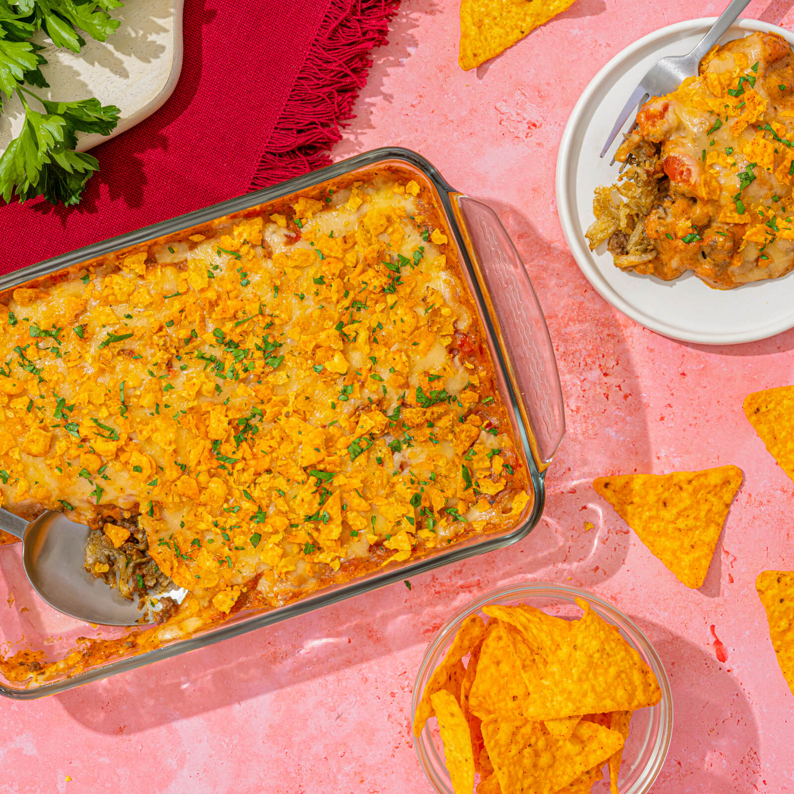 This Tex-Mex bake with hashbrowns and ground beef is finished with a cheesy DORITOS® crust for a comforting casserole that’s perfect for serving a crowd.
