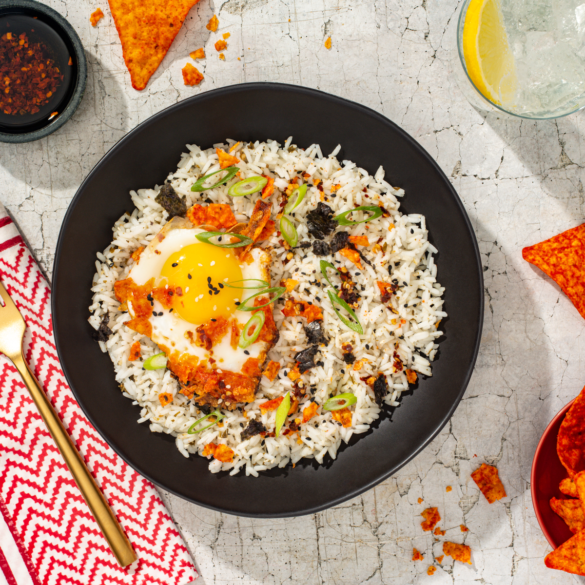 3 Divide rice evenly among 4 serving bowls. Top each bowl with a fried egg. Drizzle with remaining chili oil, and sprinkle with black sesame seeds, white sesame seeds and remaining DORITOS® FLAMIN’ HOT® Nacho Flavored Tortilla Chips. Garnish evenly with scallions.