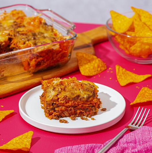 3 Arrange half the DORITOS® Spicy Nacho Flavored Tortilla Chips in basket. Top with half the Mexican cheese blend and half the ground beef mixture. Repeat layers one more time.
